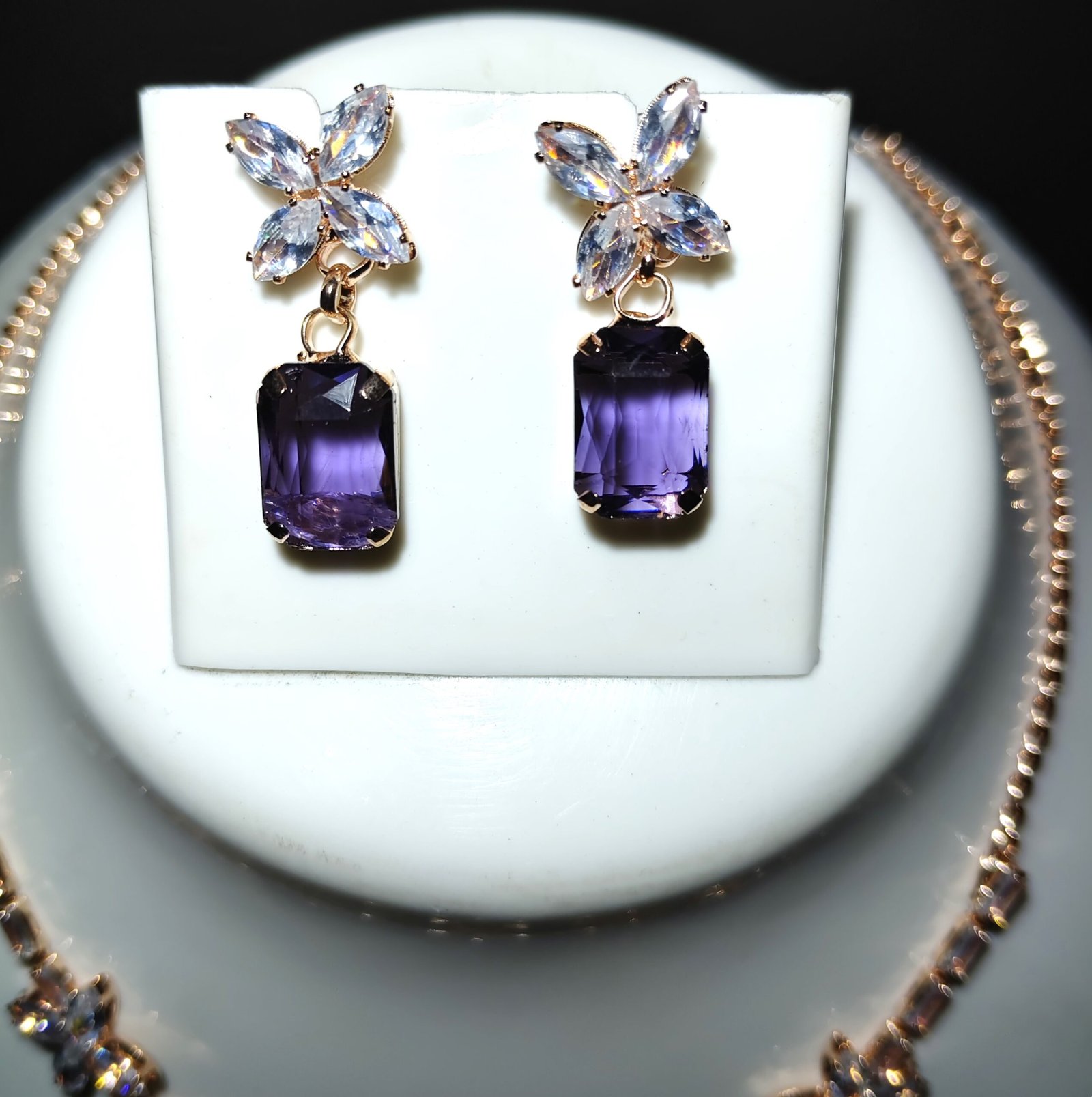 The matching earrings are a perfect complement, with two captivating purple amethyst stones nestled between delicate crystalstudded