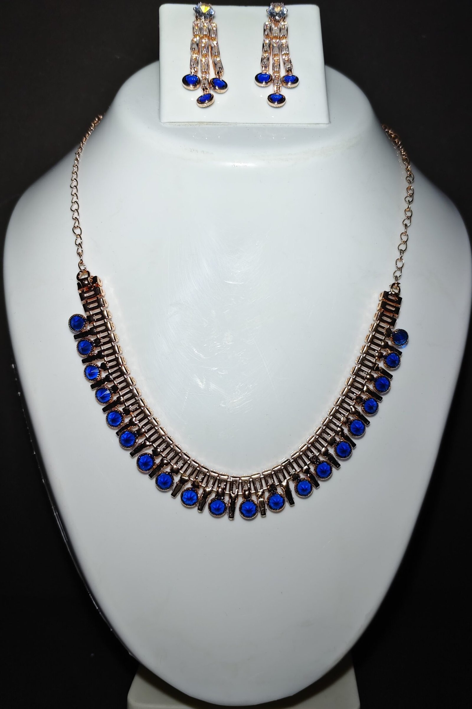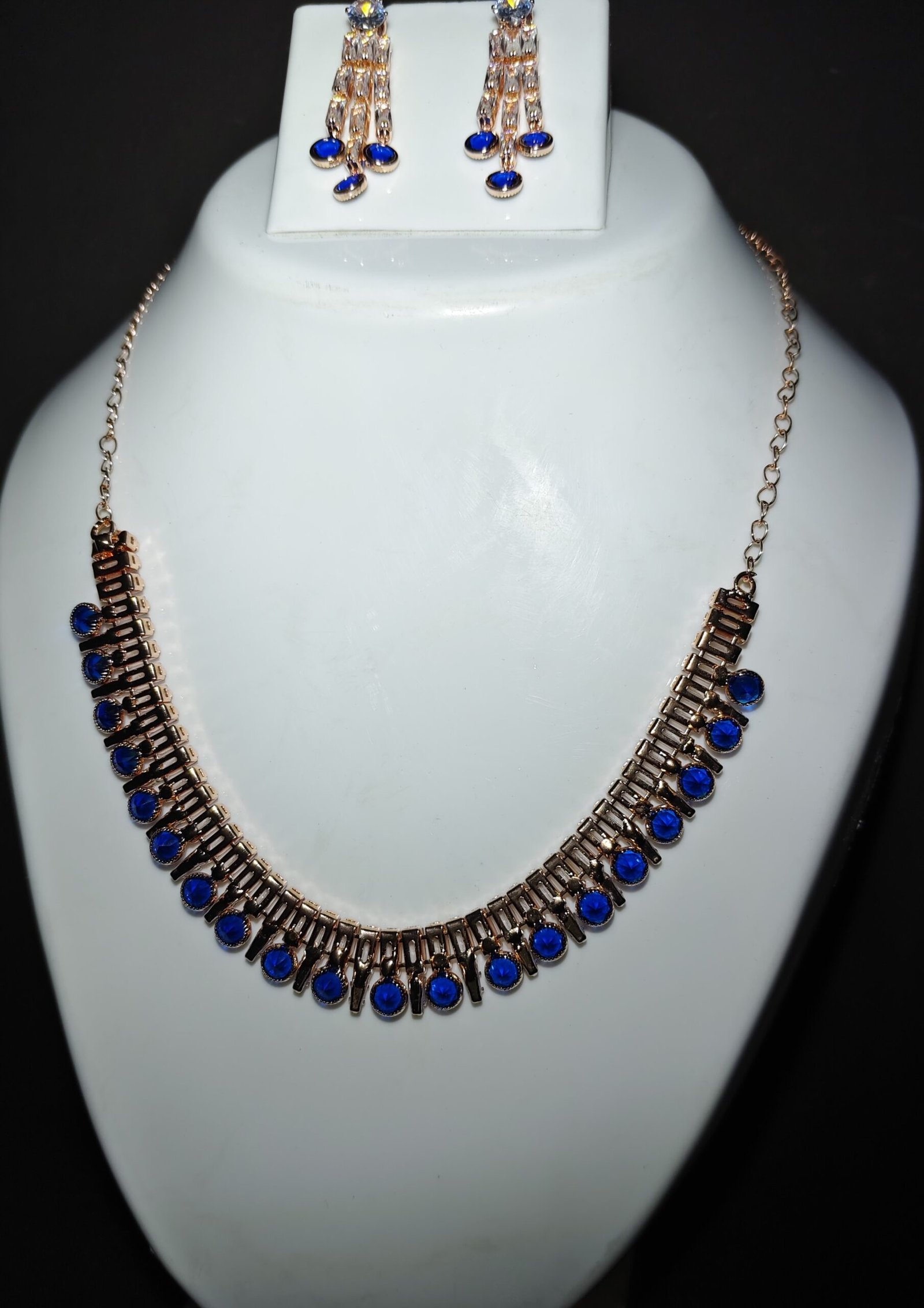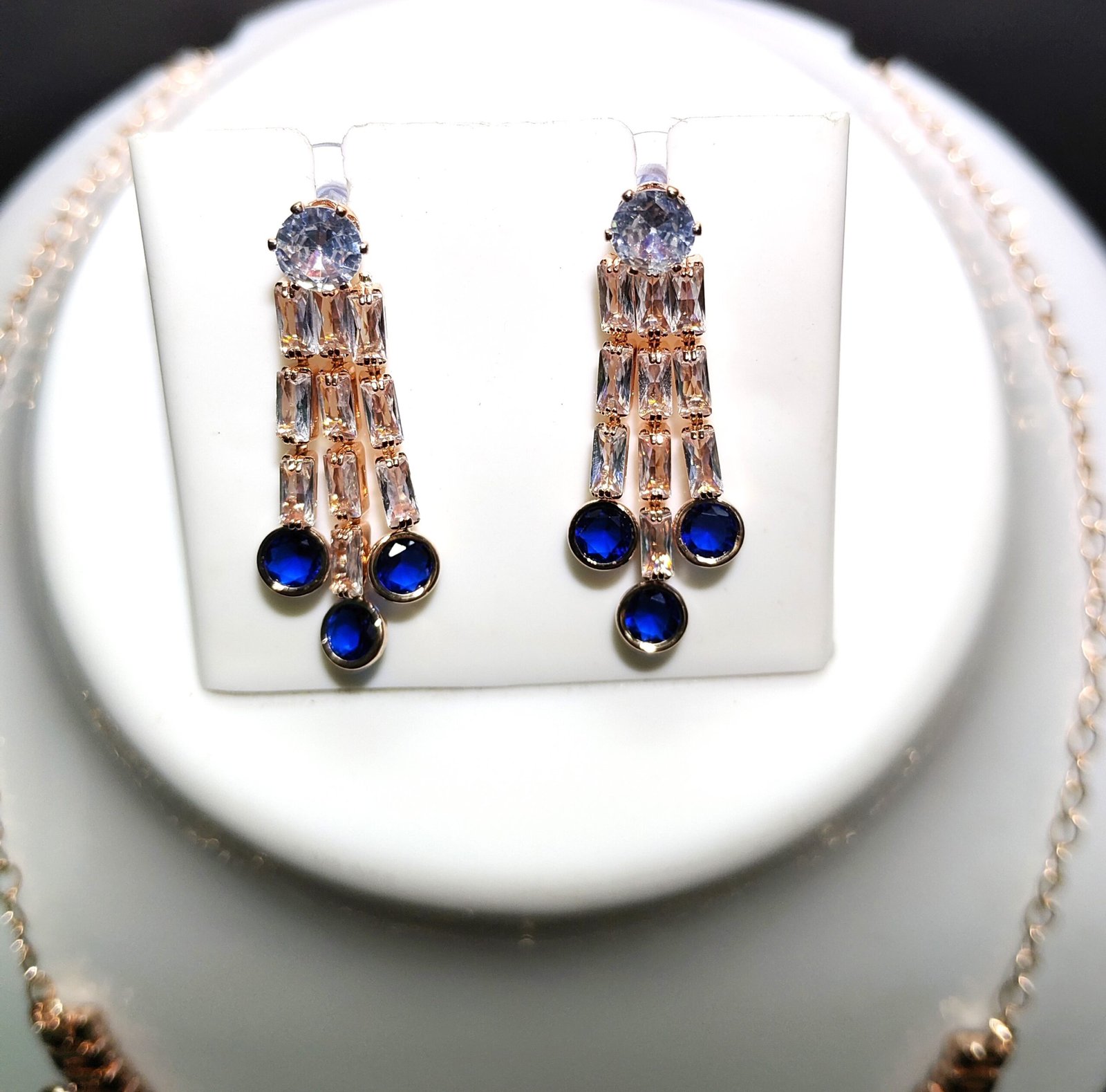 includes a pair of matching earrings, designed to complement the necklace perfectly. Each earring is adorned with similar blue stones,creating a harmonious and cohesive look.