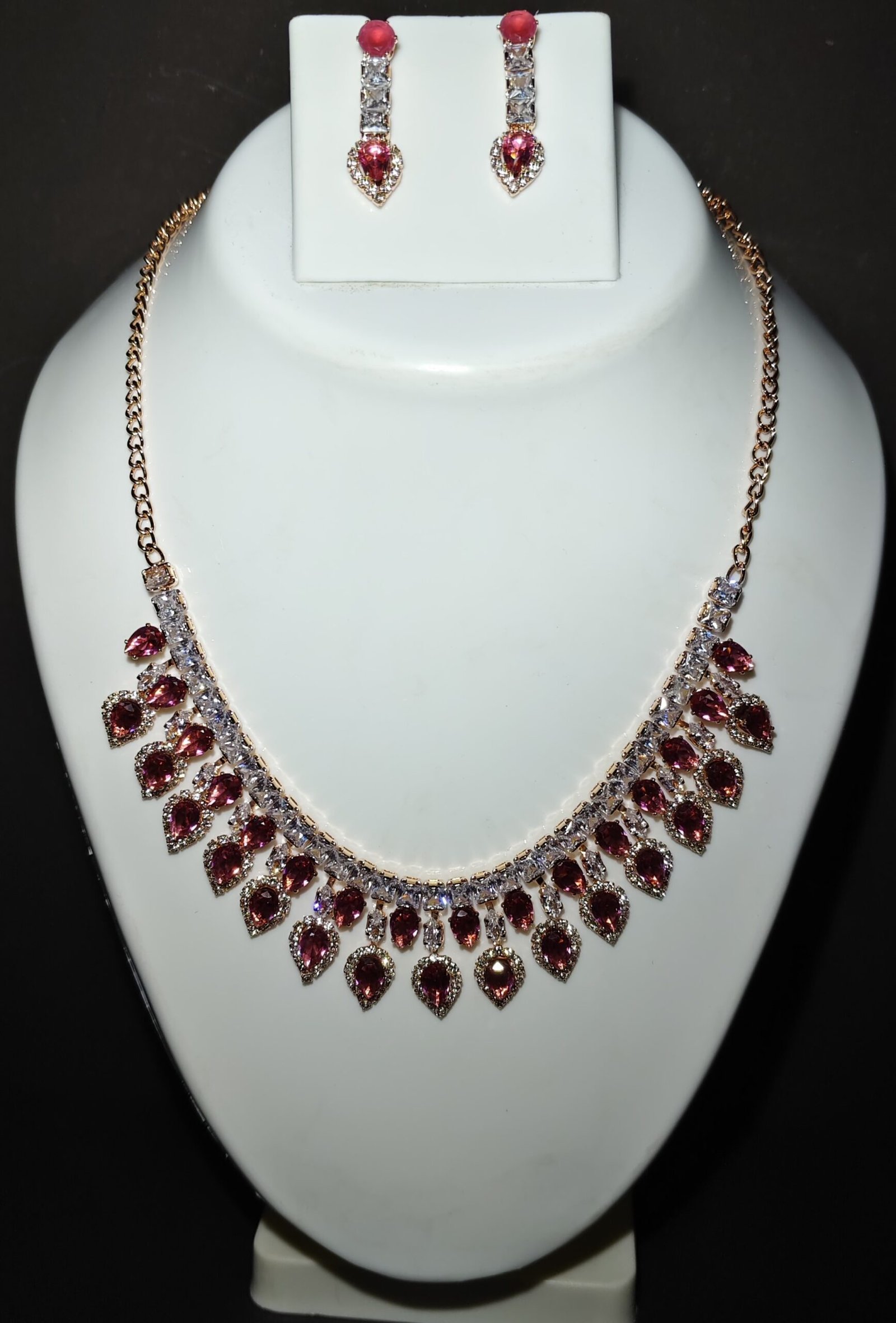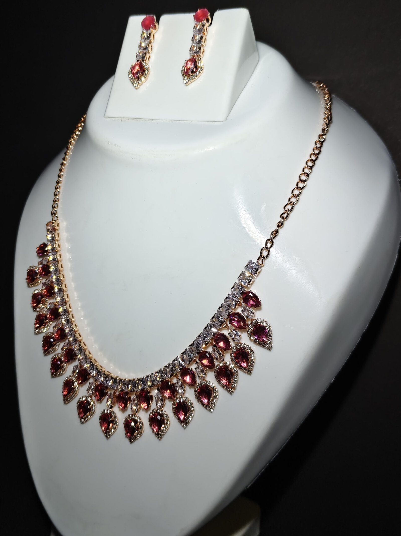 The matching earrings mirror the necklace’s elegance with their charming drop-style design, sparkling in harmony with the necklace