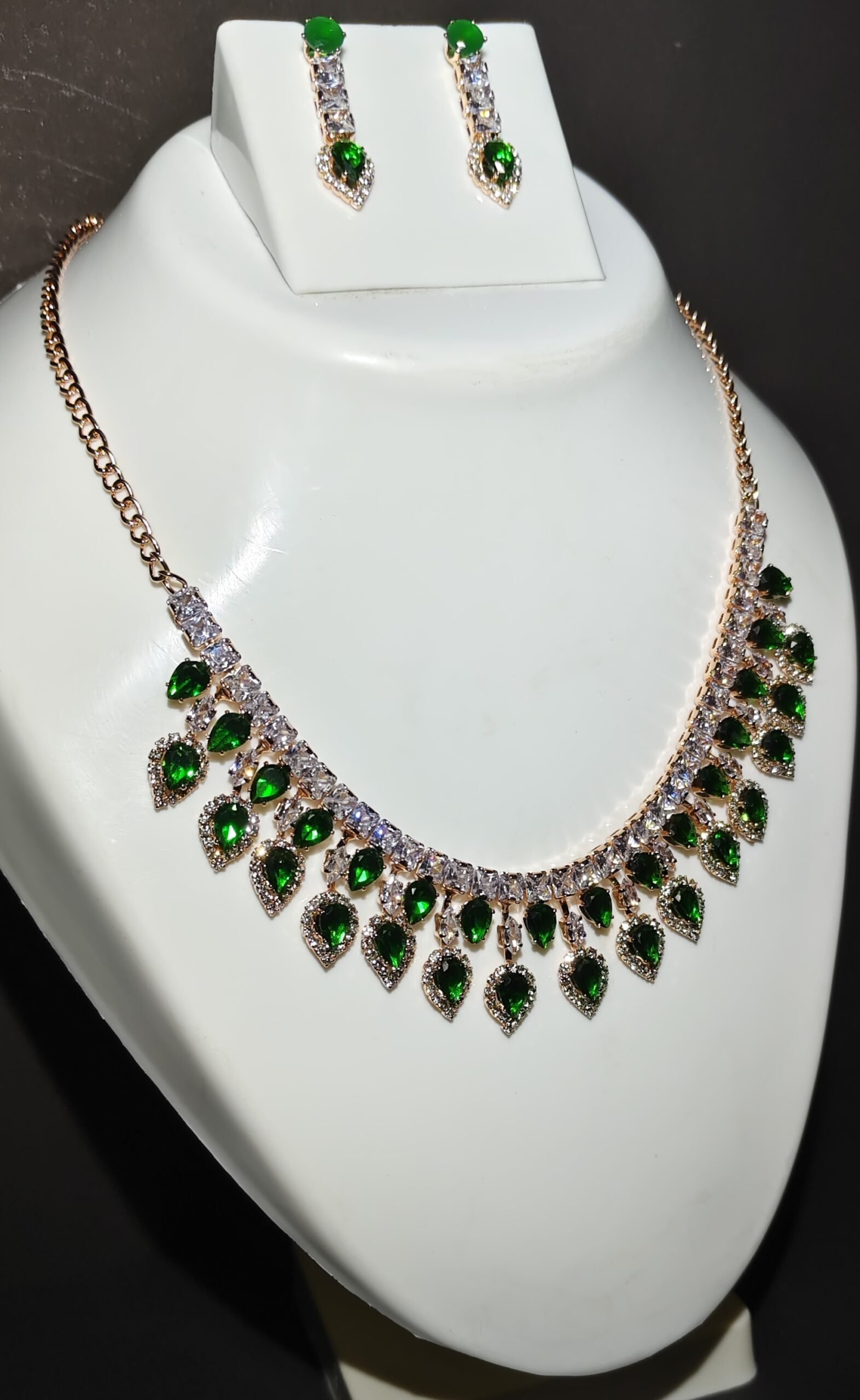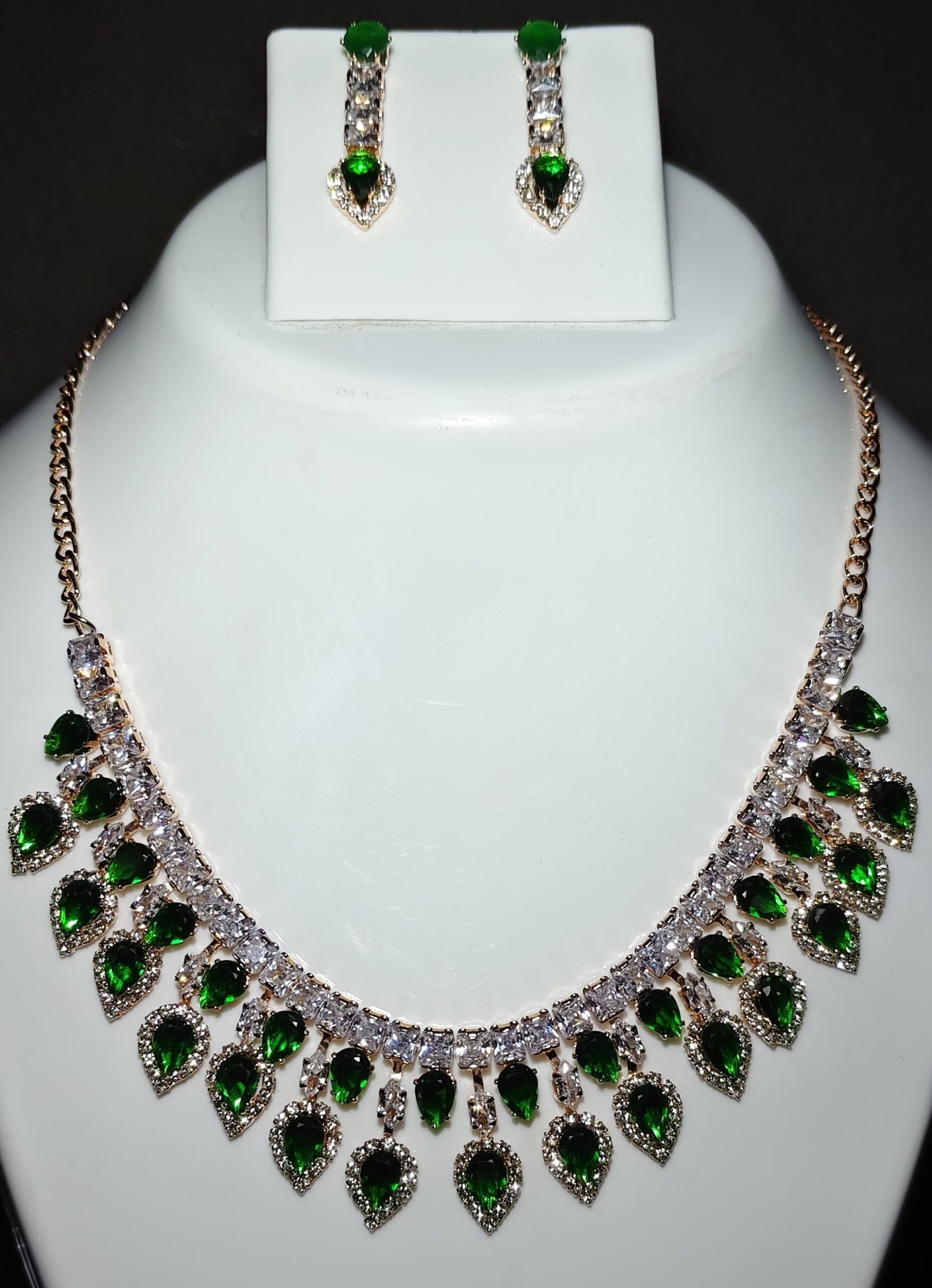 Crafted with precision, the necklace features a gorgeous arrangement of pear-shaped emerald green stones, delicately bordered by