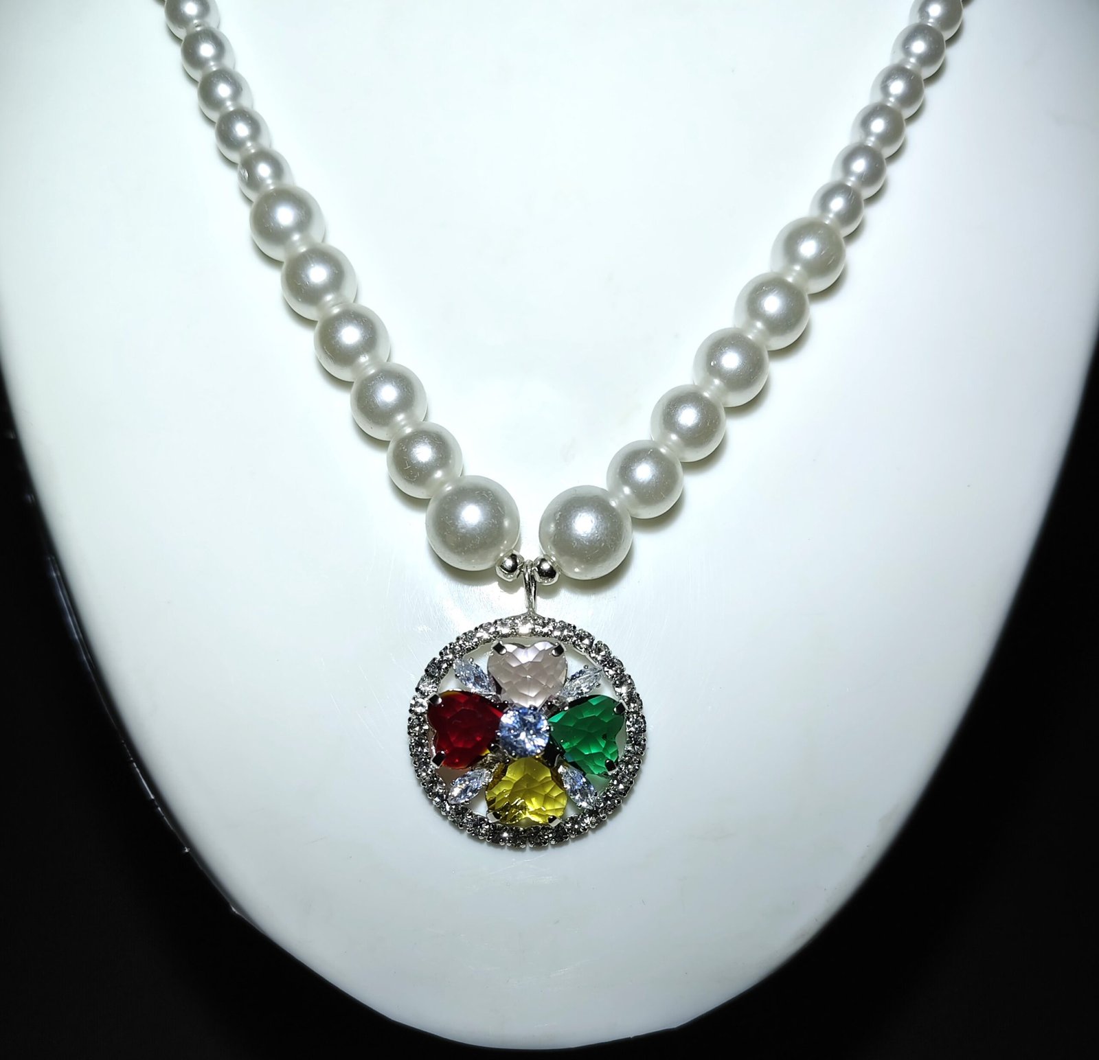 each perfectly polished to achieve a radiant sheen. The highlight of the piece is a stunning pendant with vibrant gemstones that catch