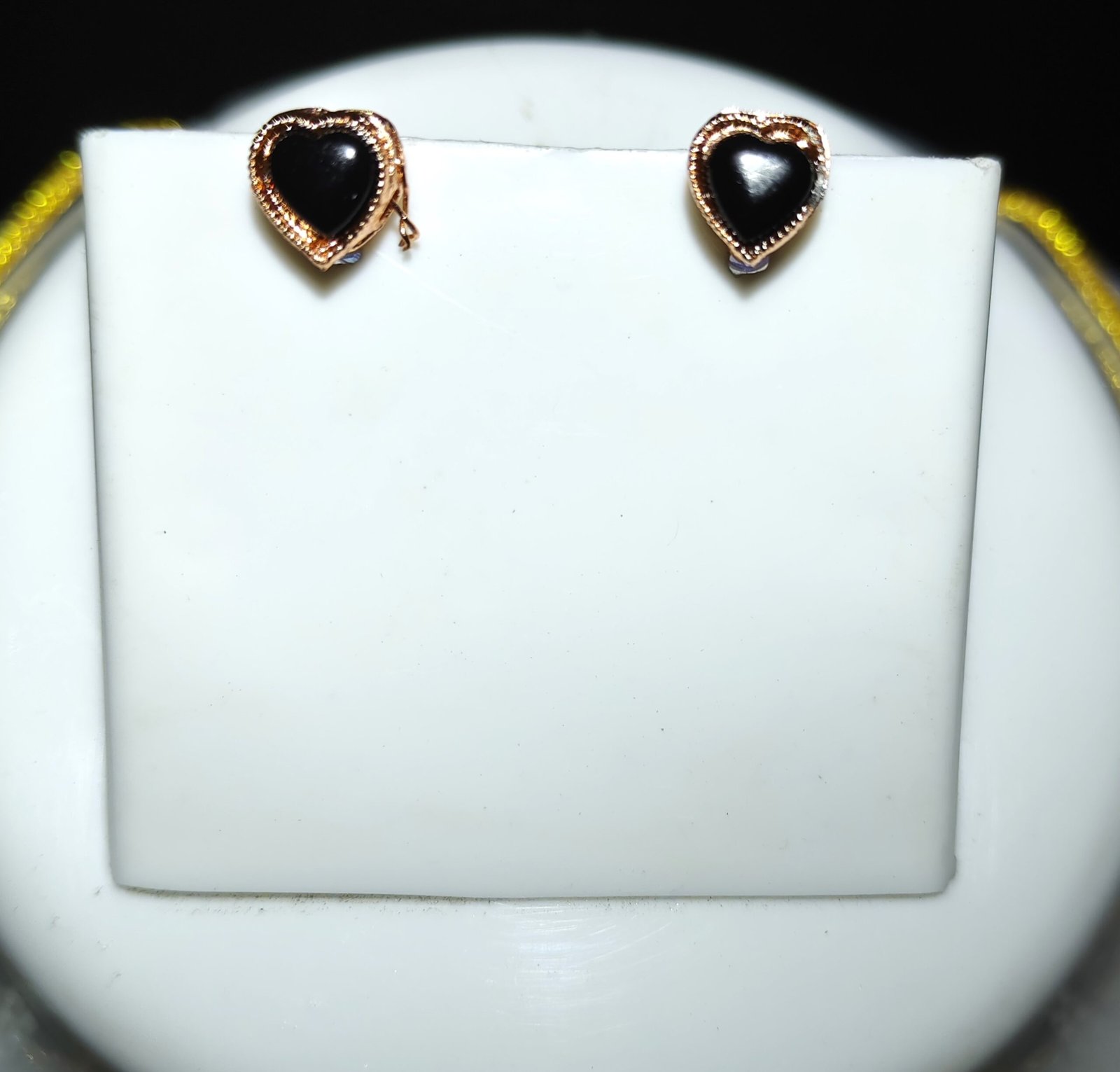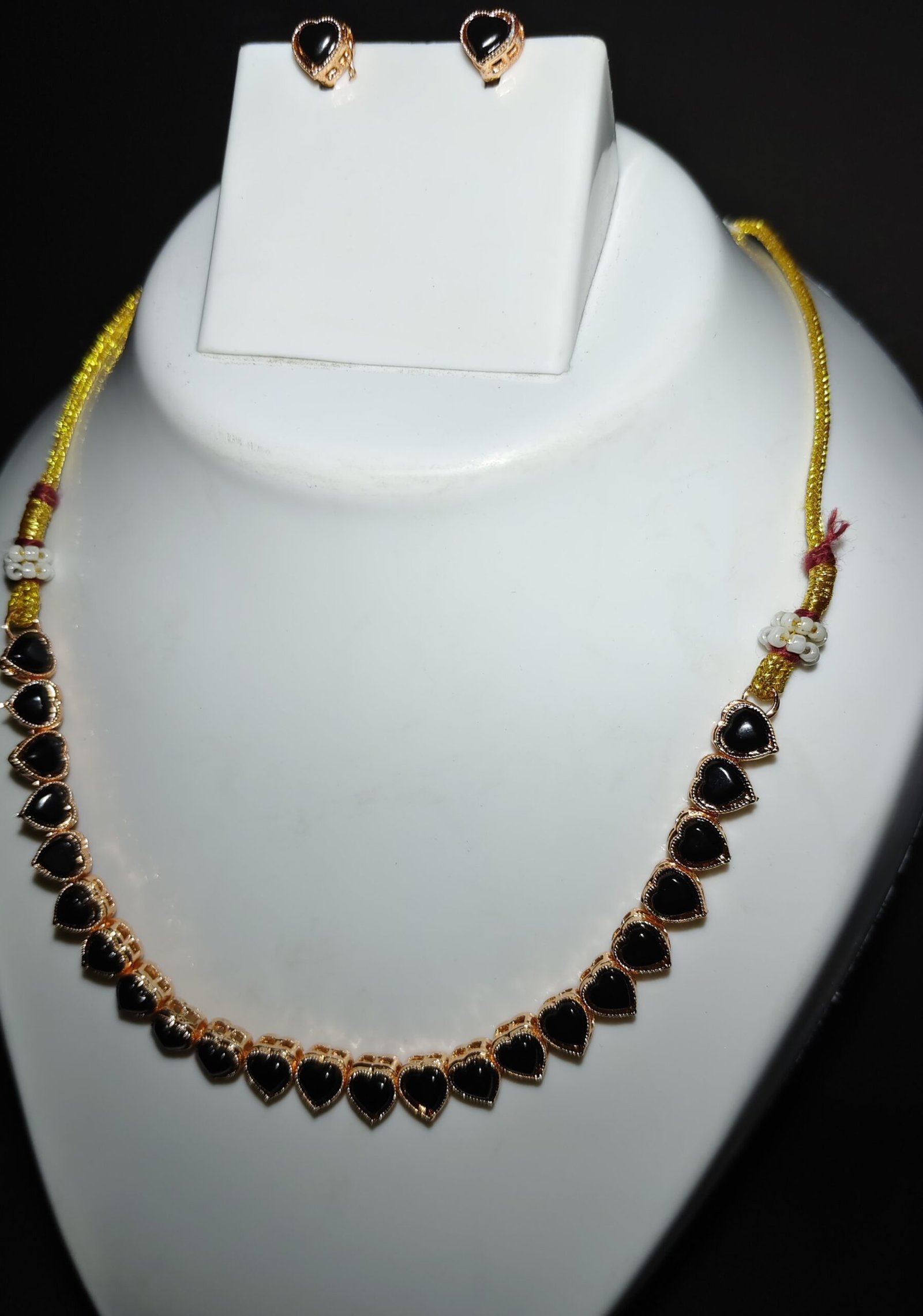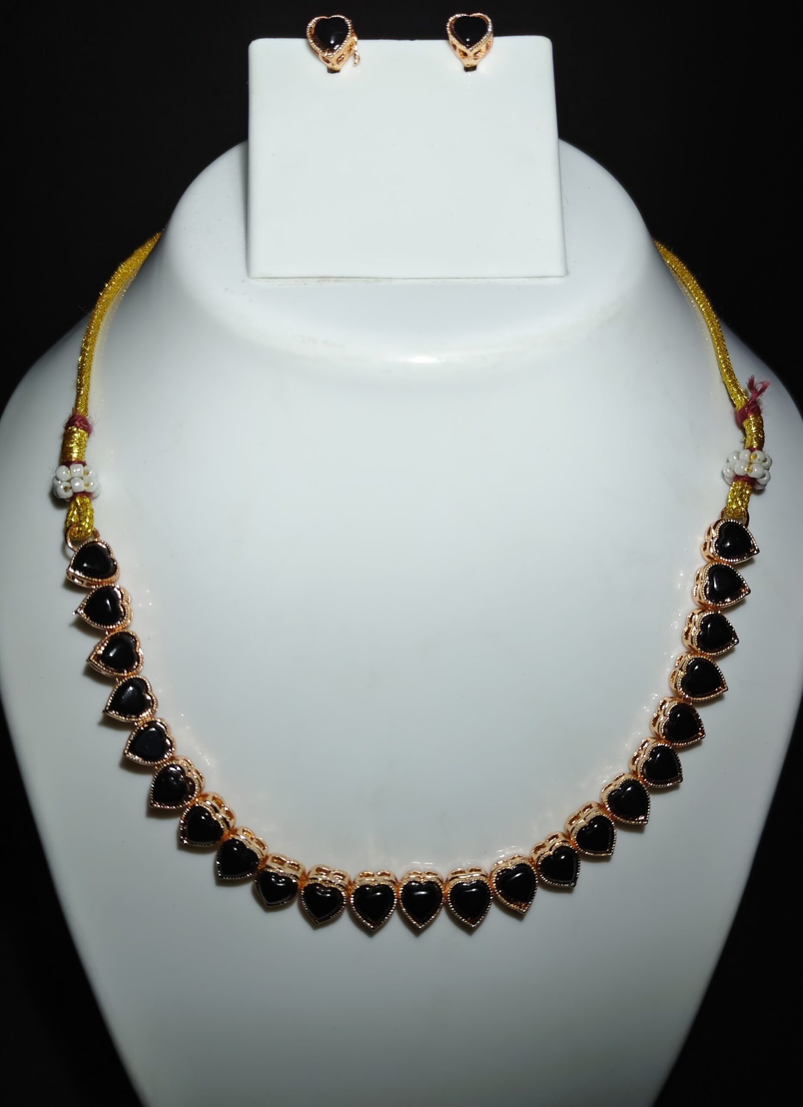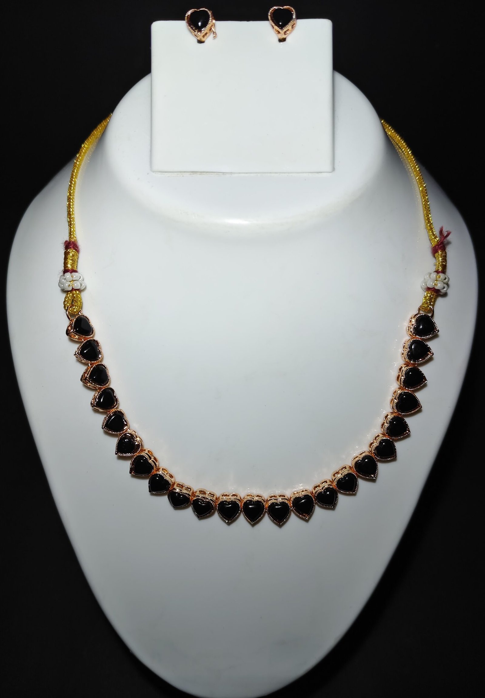 Each piece is meticulously crafted using high-quality materials. The necklace and earrings are adorned with heart-shaped black stones