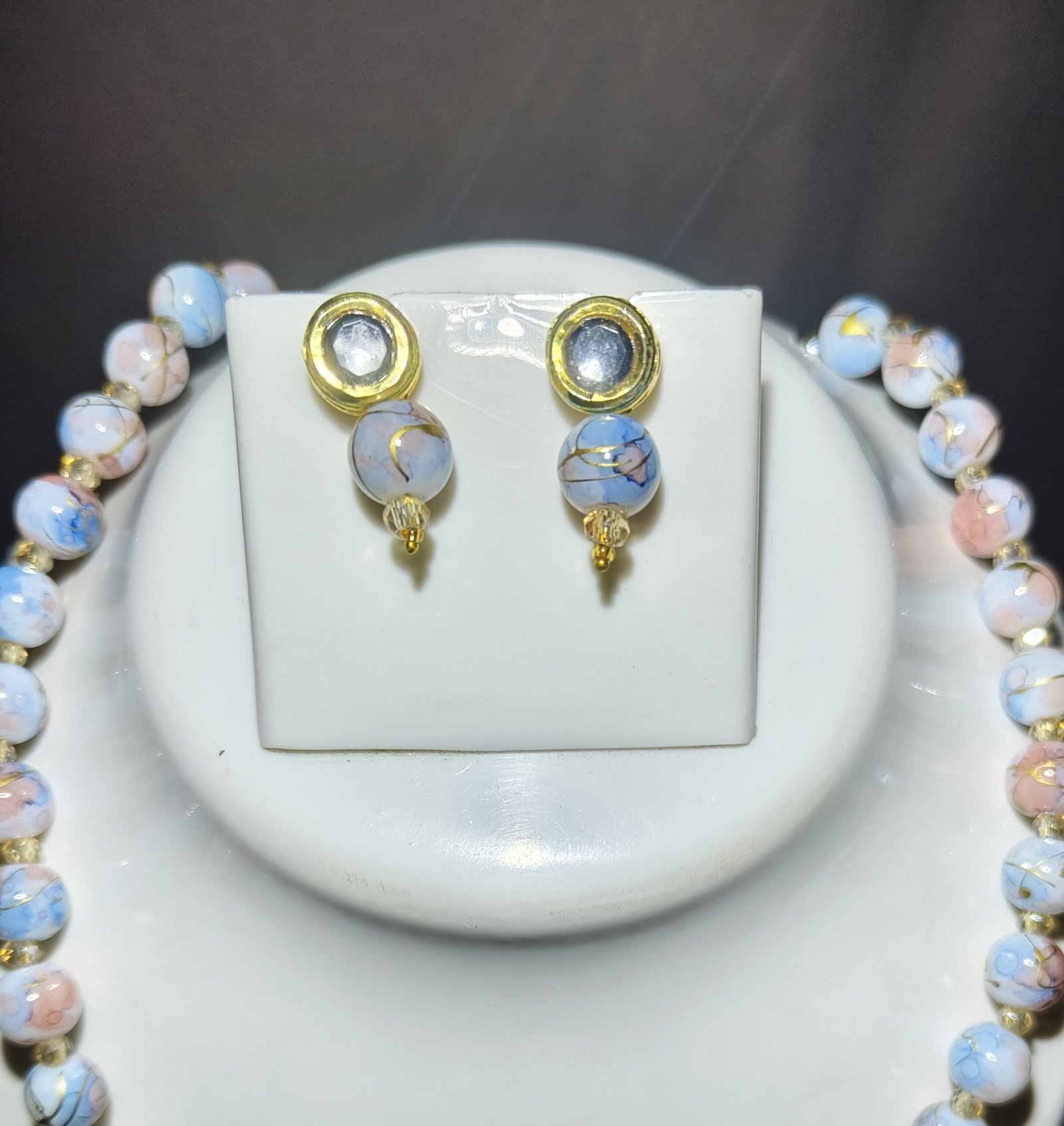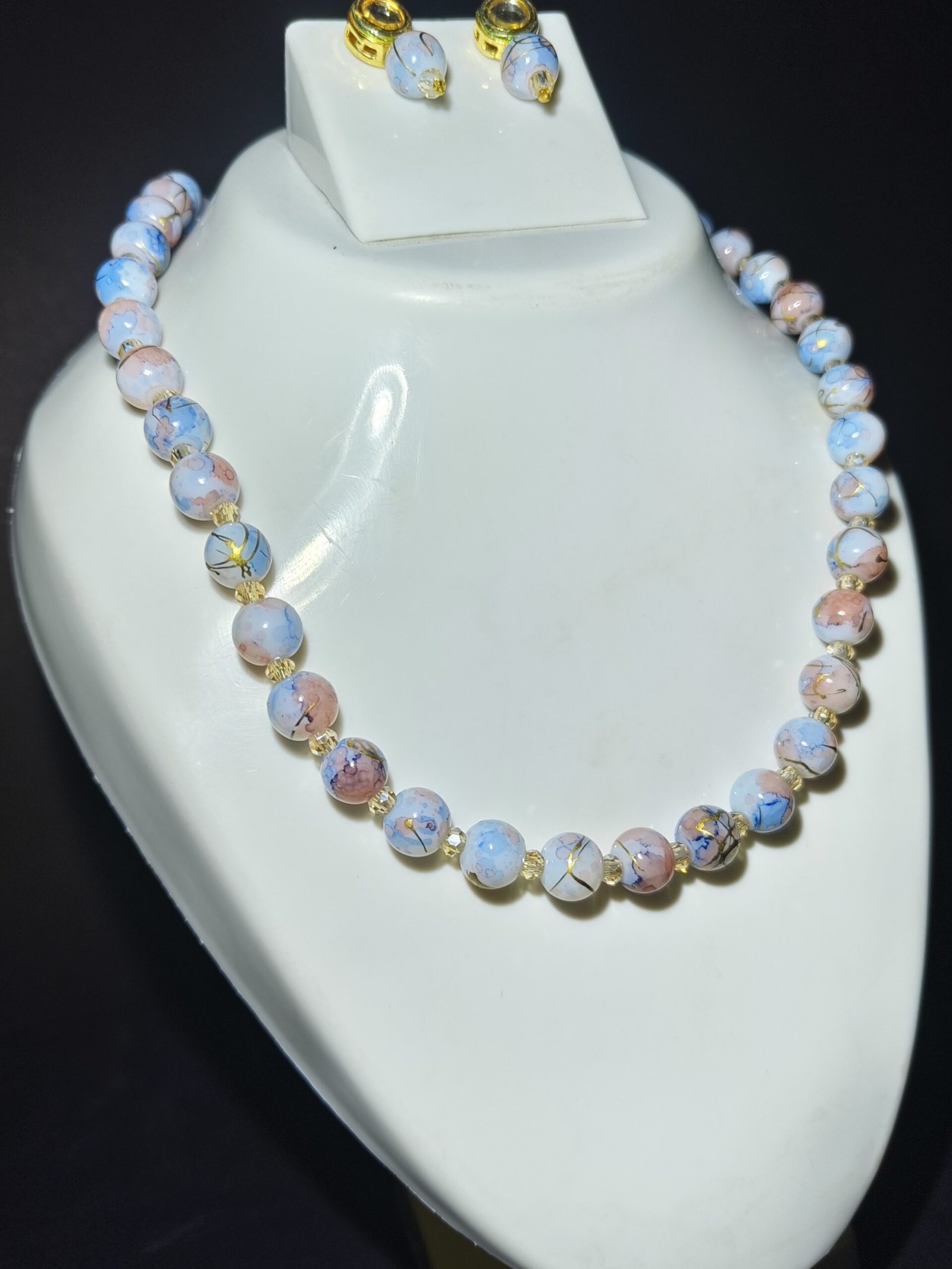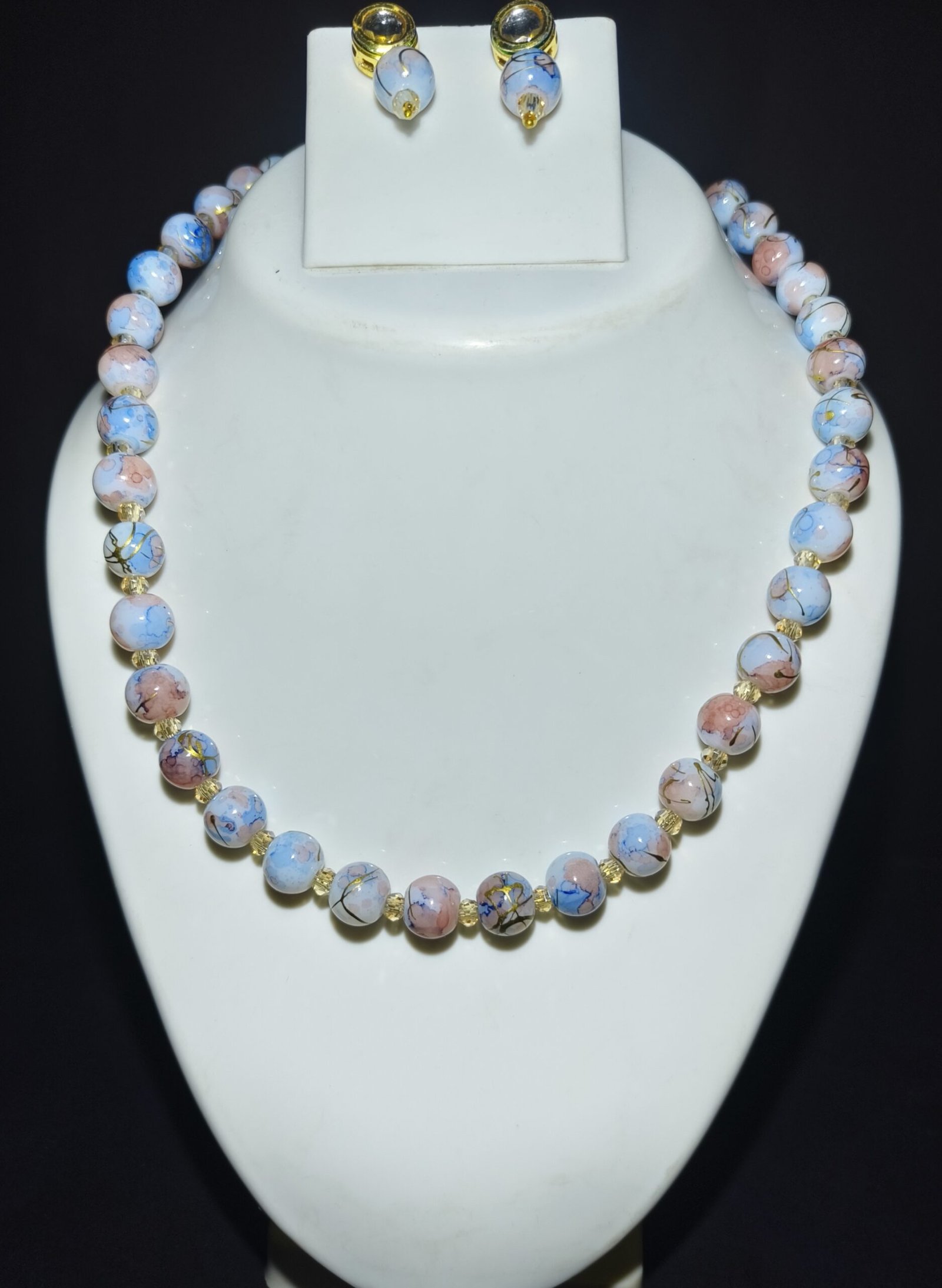 Introducing a timeless beauty that will elevate any look – our Elegant Pink and Blue Marble Bead Necklace & Earring Set. Crafted with