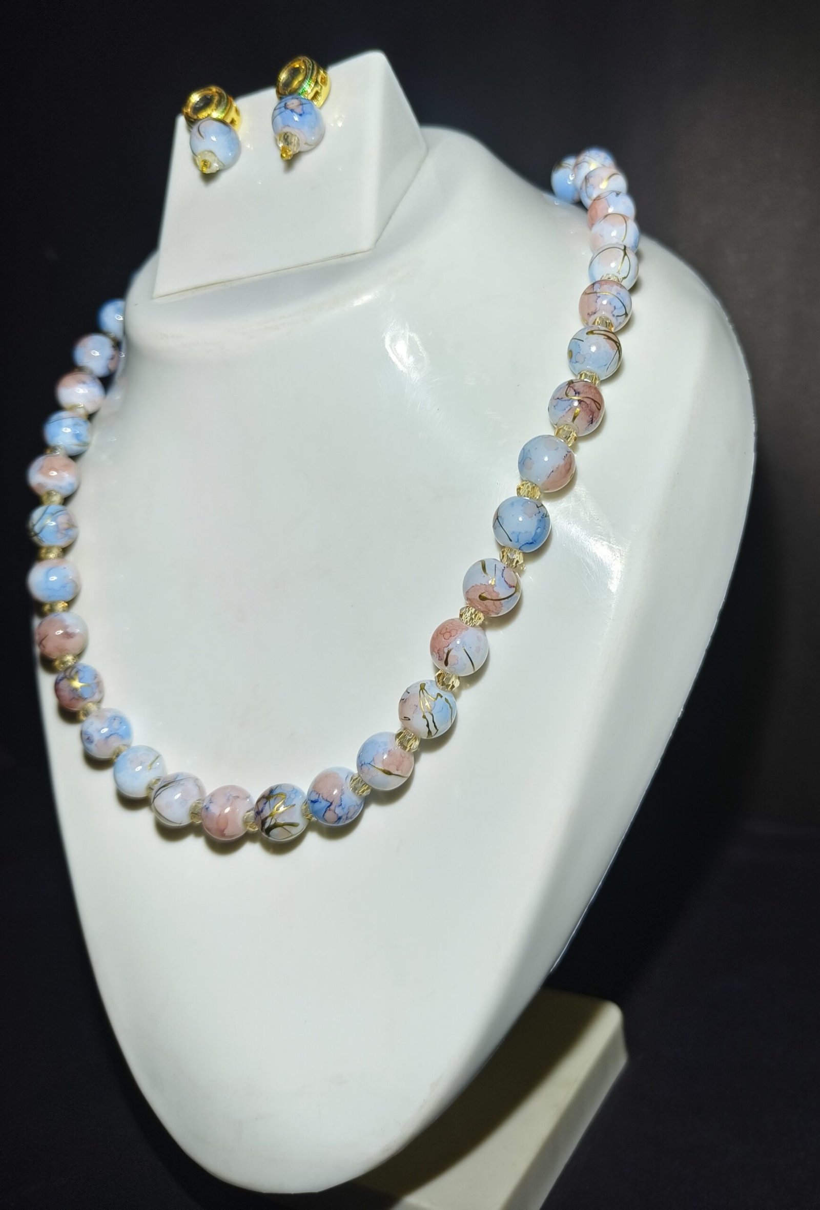 Elegant Pink and Blue Marble Bead Necklace & Earring Set