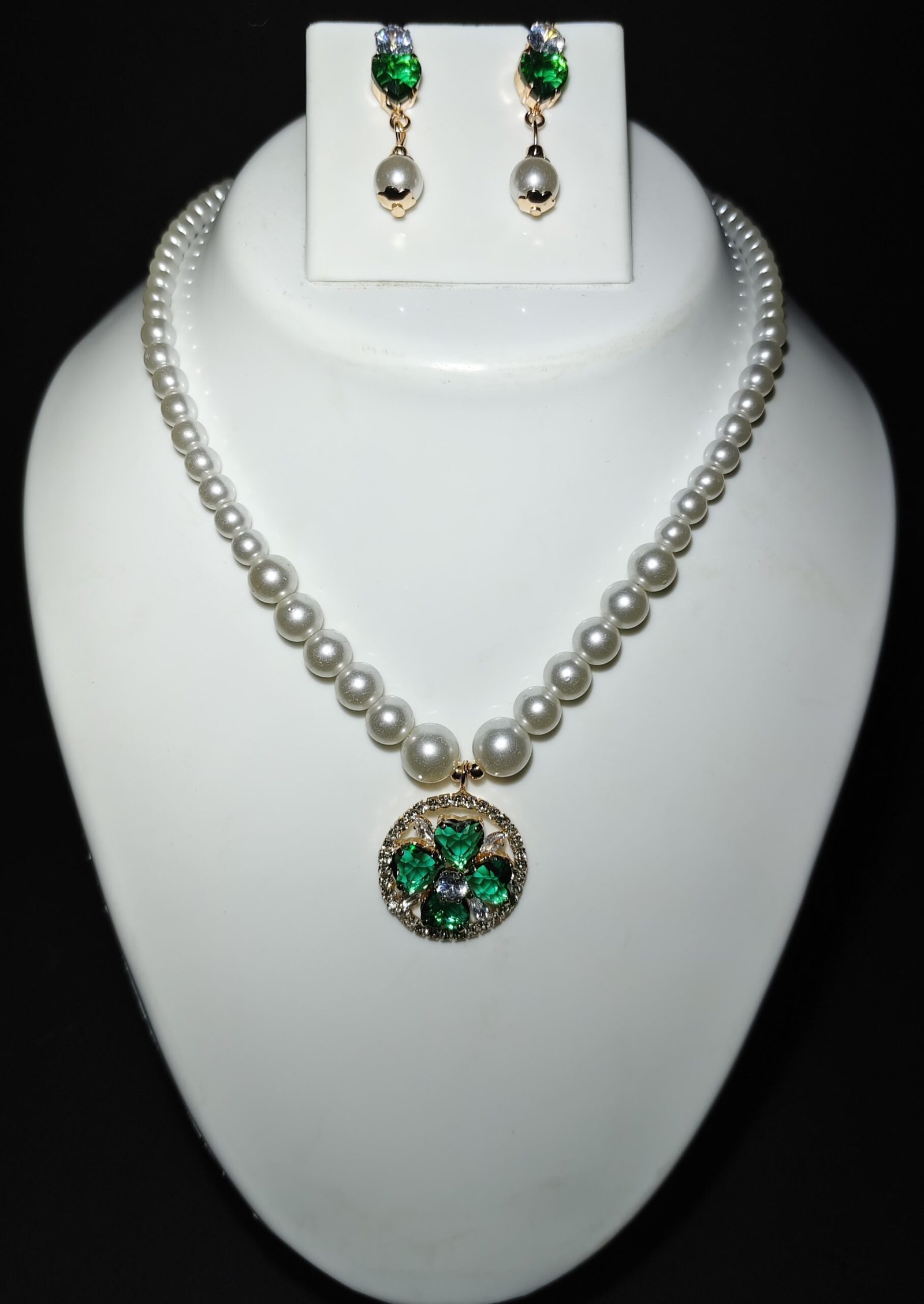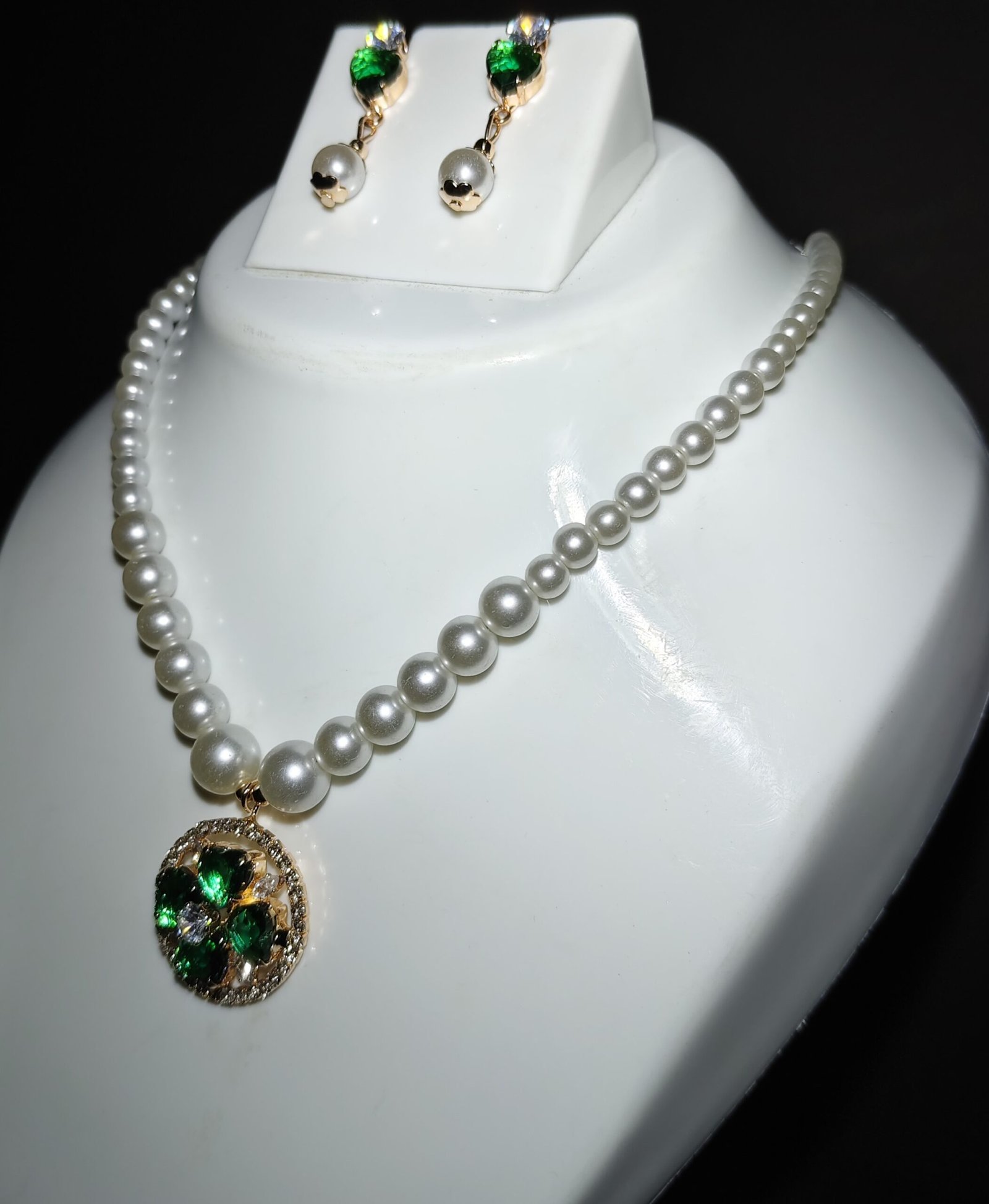 Elegant Pearl and Green Gem Necklace Set