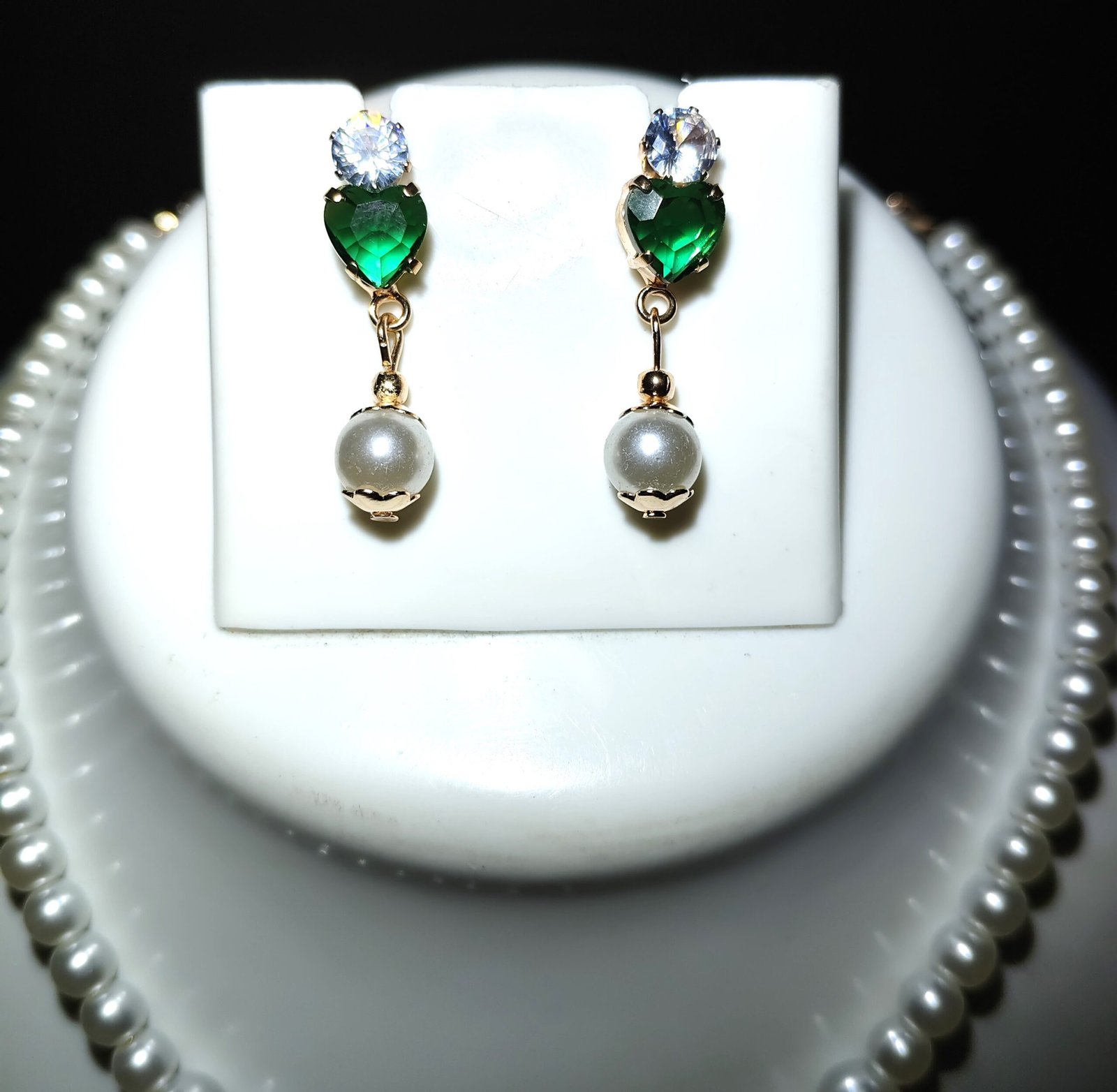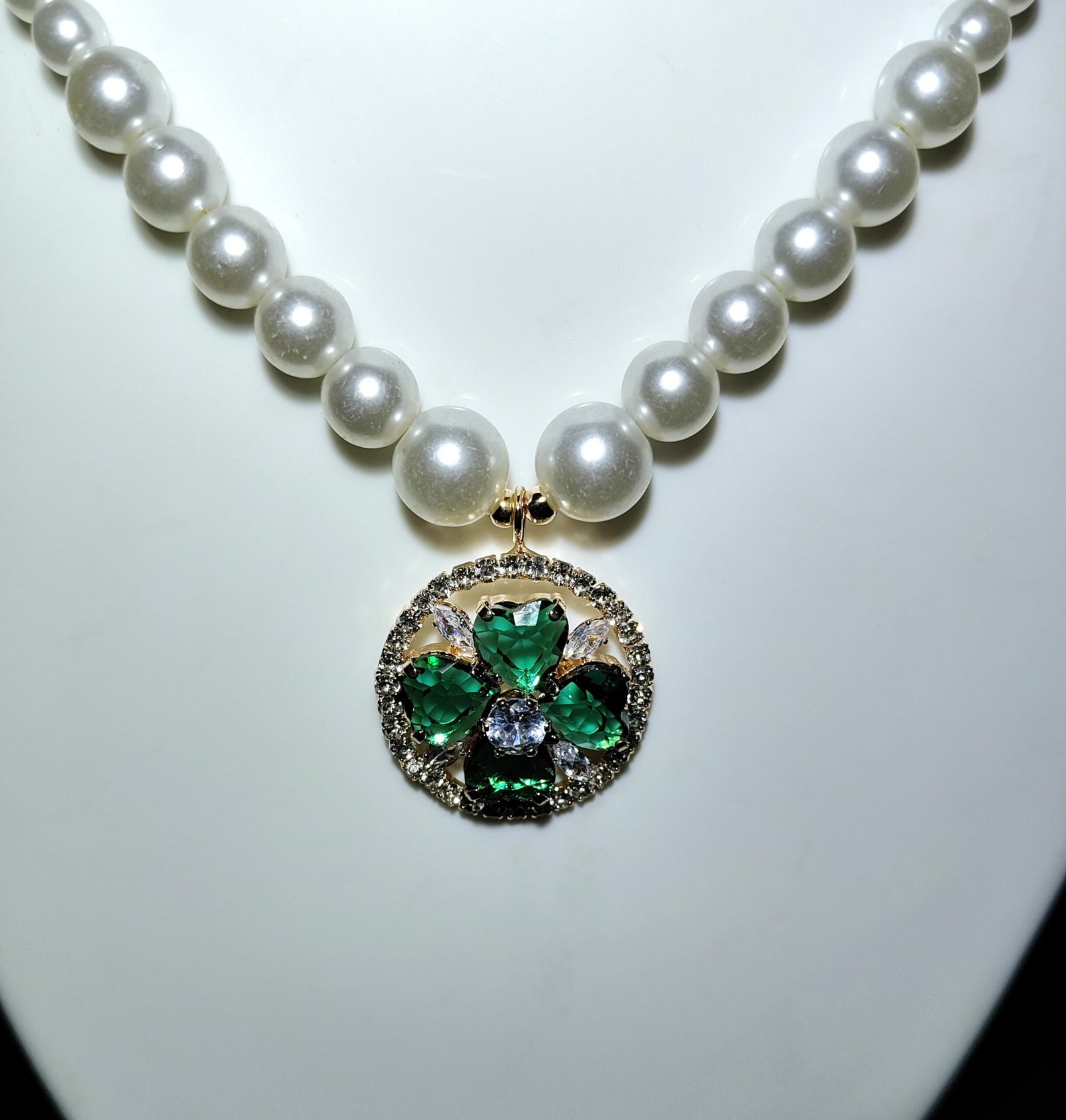 adorned with an eye-catching pendant that showcases green emerald-like gems paired with dazzling clear crystals, bringing an aura