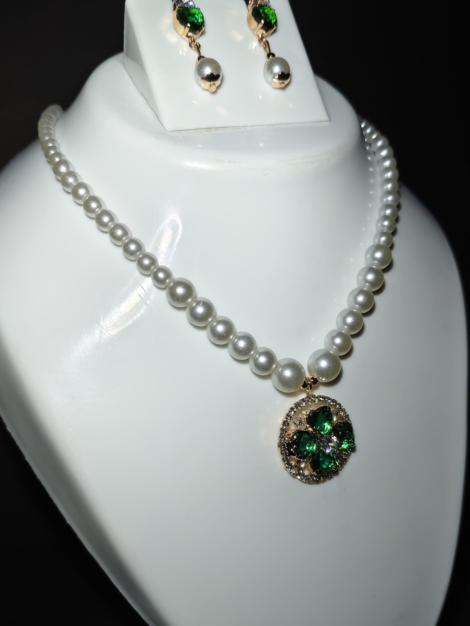 Step into a world of luxury with this stunning pearl and green gem necklace set, designed to captivate. This gorgeous piece is crafted