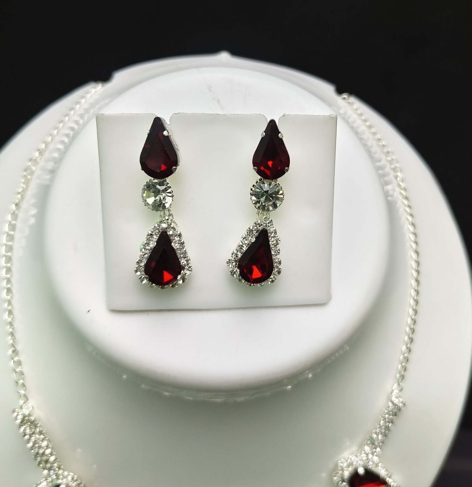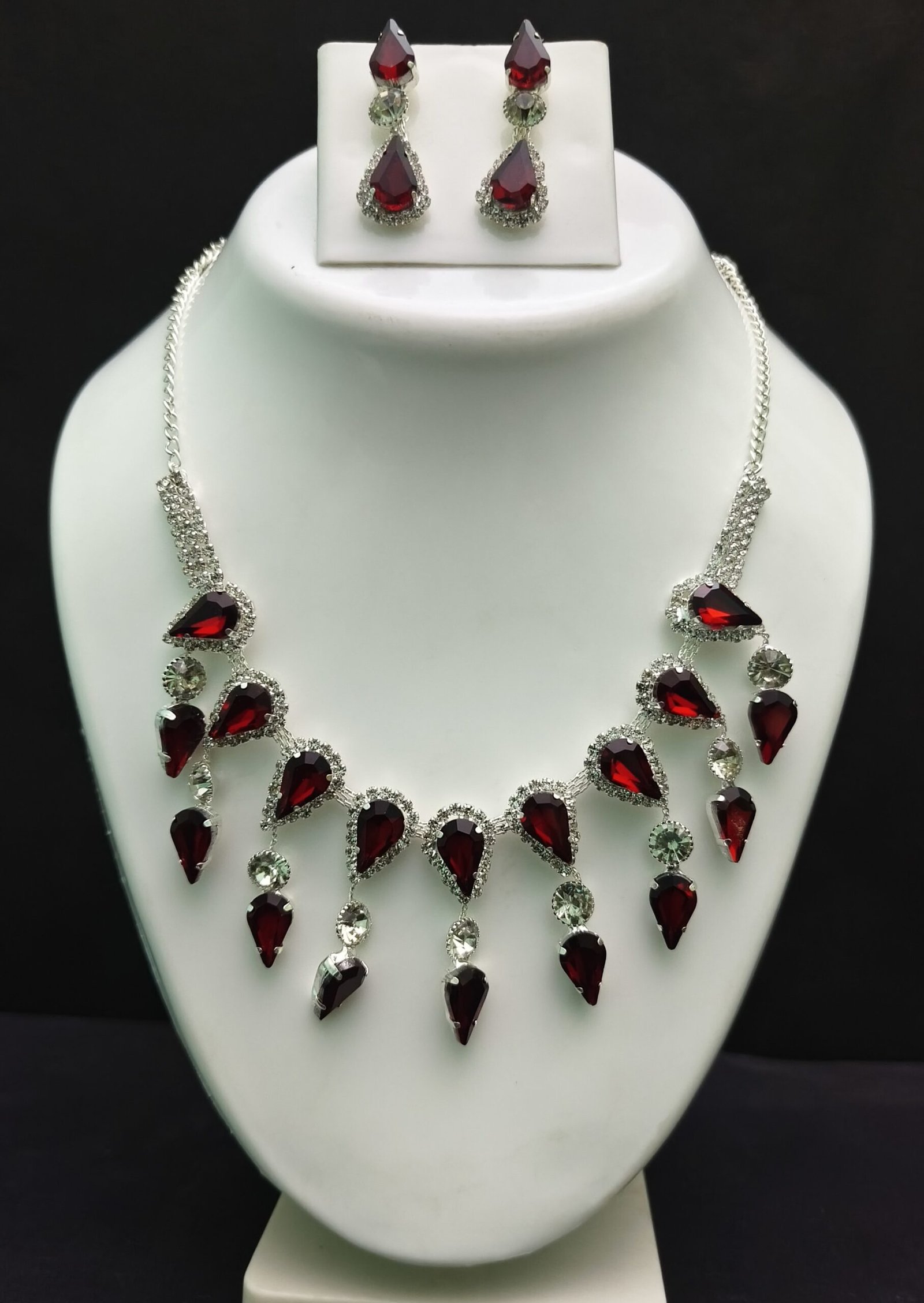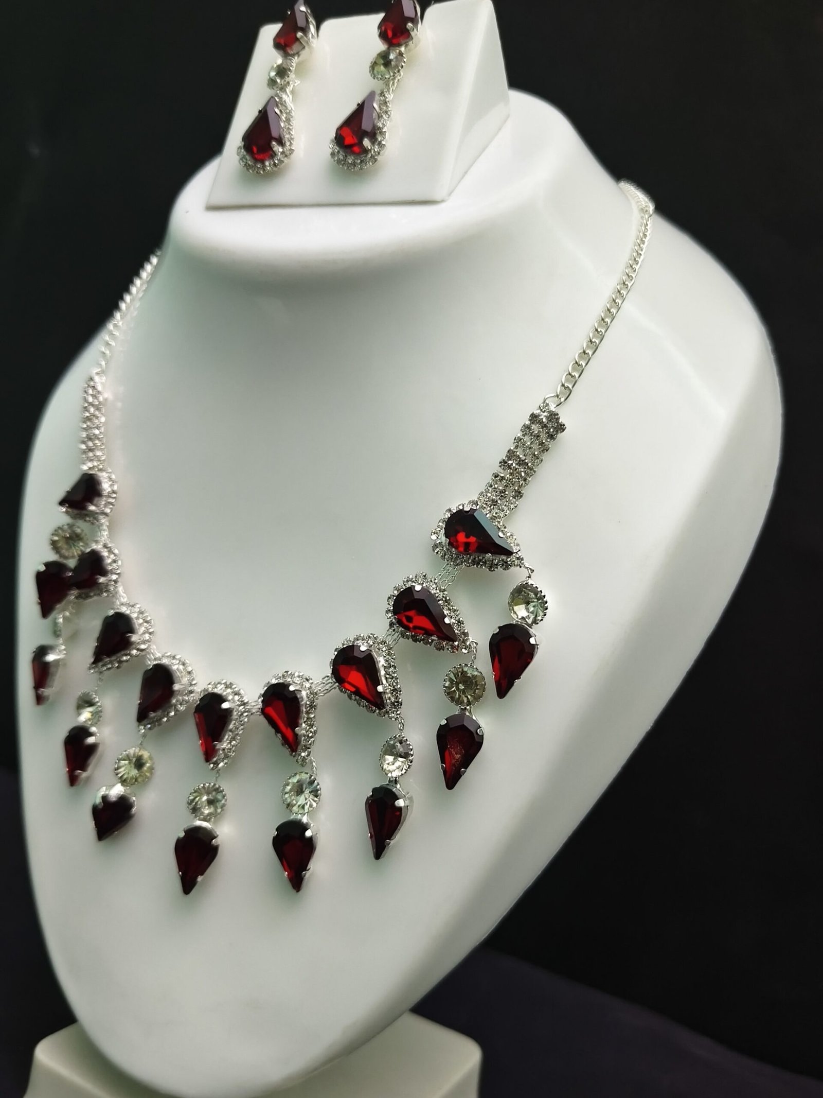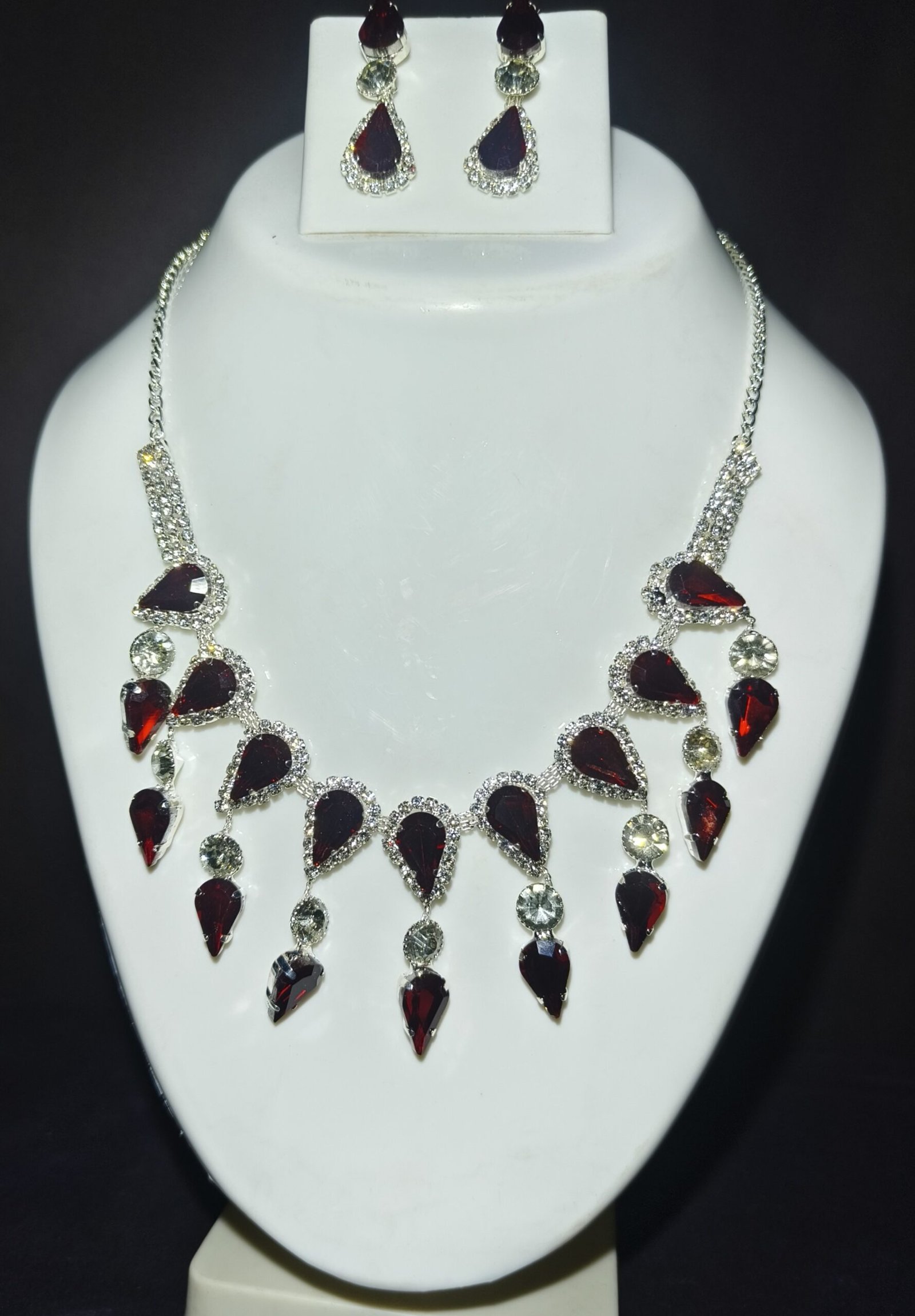 The necklace is equally captivating, featuring a symmetrical design with alternating teardrop red stones and shimmering clear crystals.
